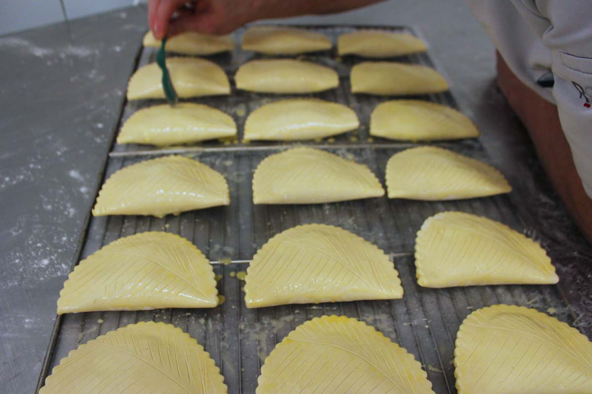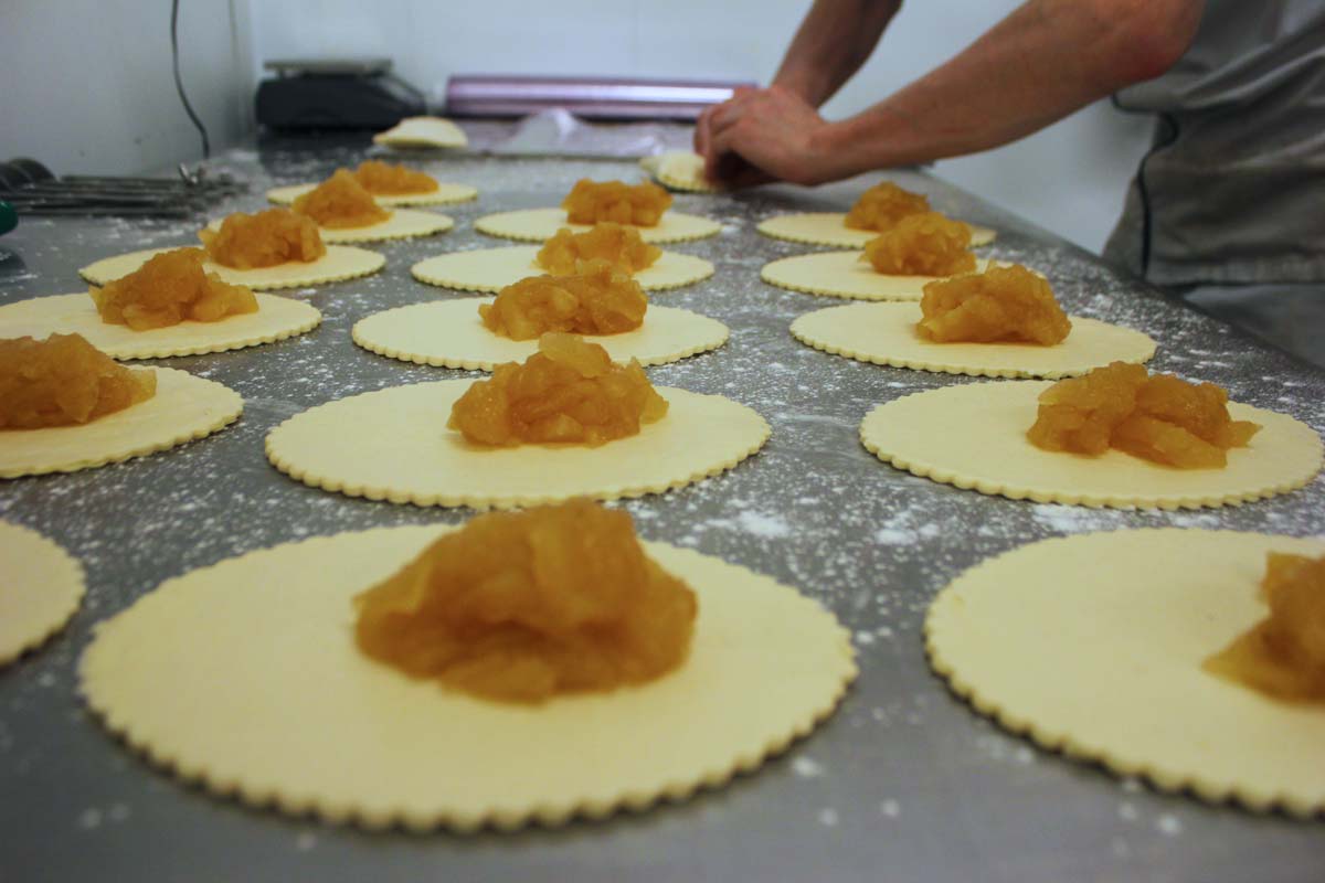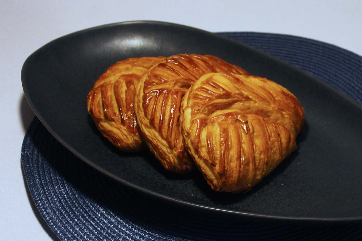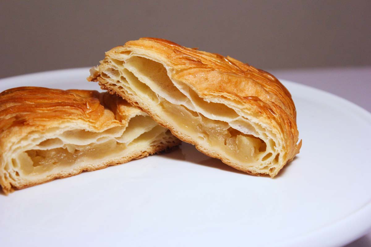 The chausson aux pommes is the longest viennoiserie to bake. It requires four steps. First, prepare the croissant dough. Then, time to cook a homemade apple compote. The Pink Lady is used because of its natural sweetness, which prevents adding more sugar to the recipe. Then comes the filling of the compote and the folding of the pastry. Finally, the last step is the scoring of the dough, also called “grignage”. What a journey!