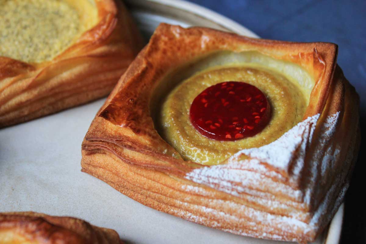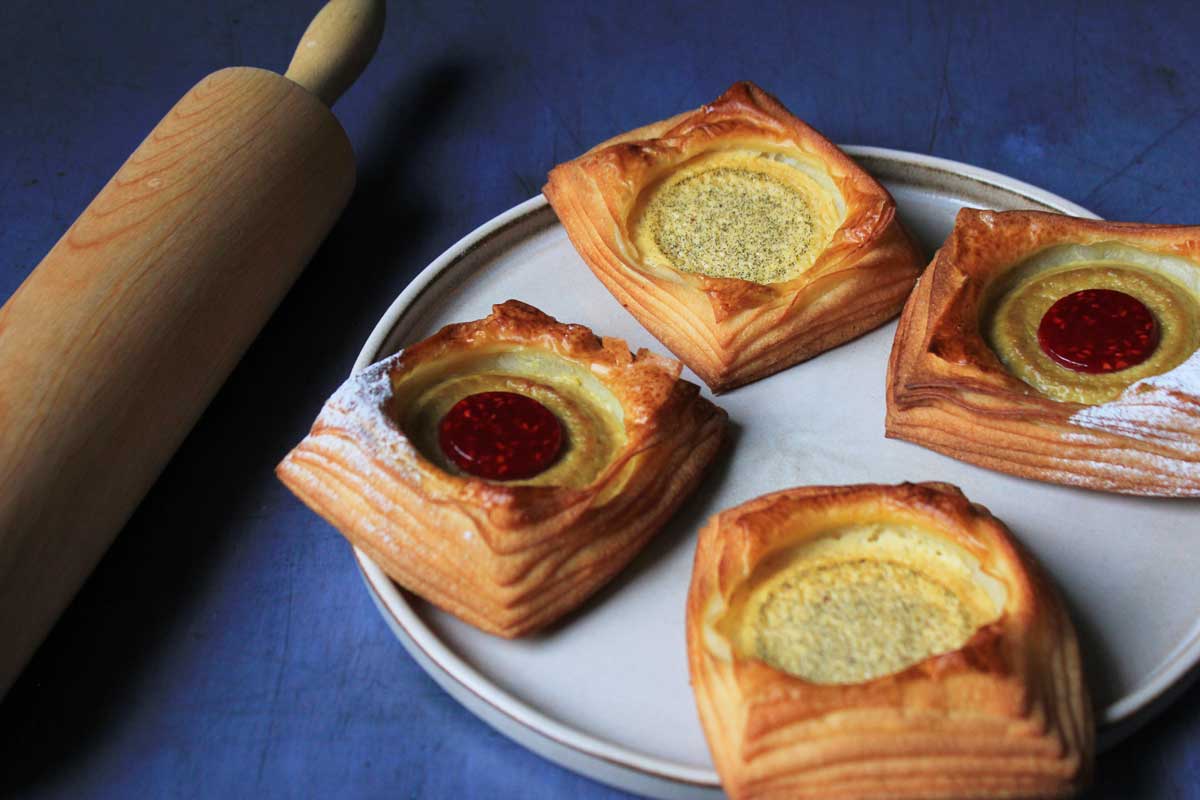 A danish is at the border of the viennoiserie and the pâtisserie. According to the Danish bakers’ union, the distinctive dough was created 350 years ago by a French apprentice baker who forgot to add butter to the flour and tried to hide his mistake by folding lumps of it into the dough. The result was the lightest dough ever seen in France.